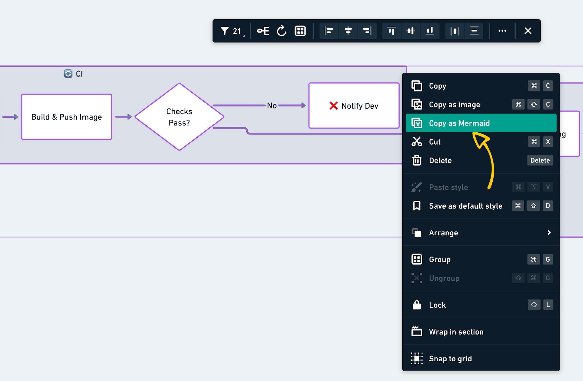 You can export any flowchart or sequence diagram back out as Mermaid code for use with GitHub, Notion, GitLab, or other tools that render Mermaid code.