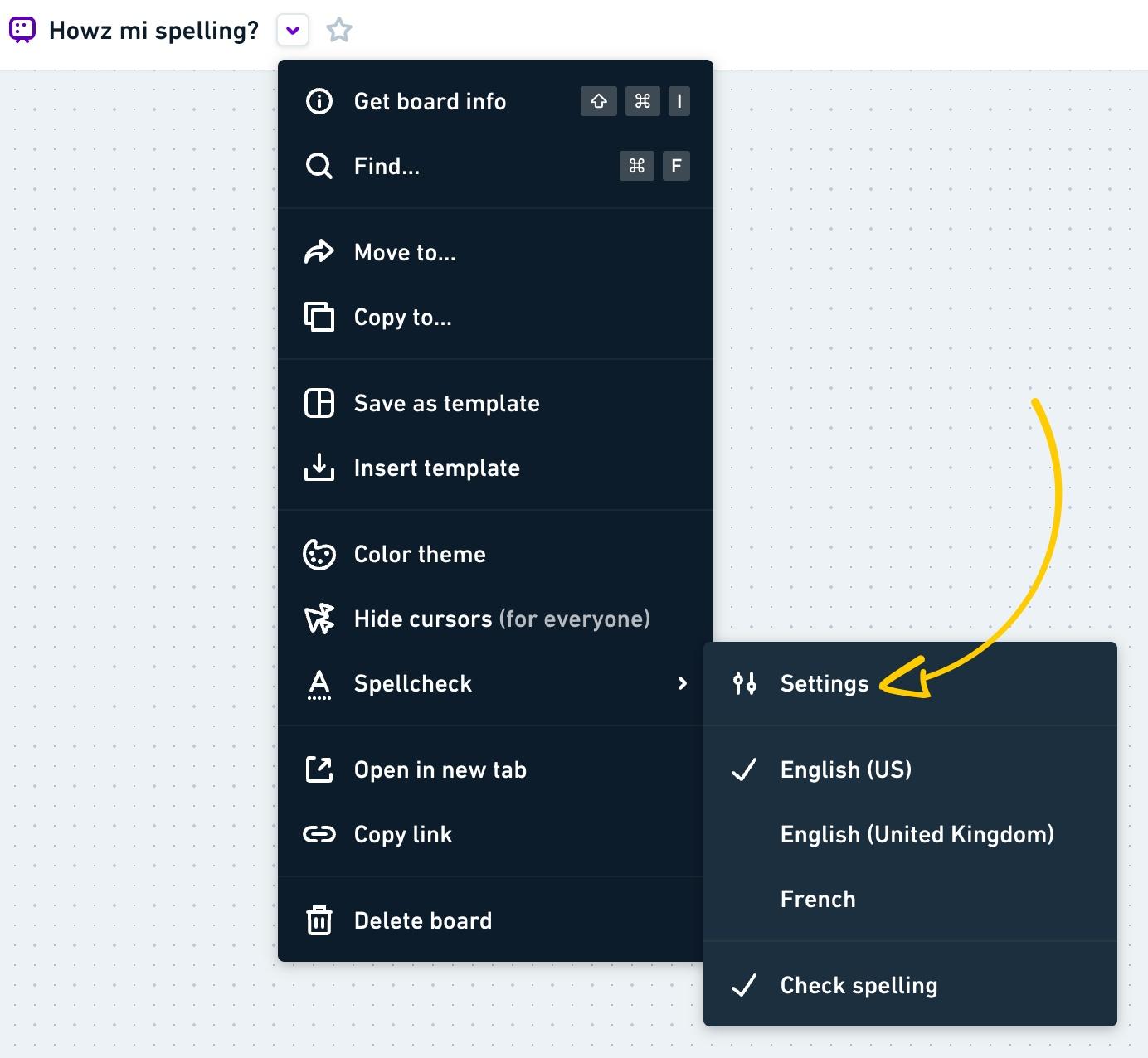 To access spellcheck settings, open a the file settings menu and select "Spellcheck":