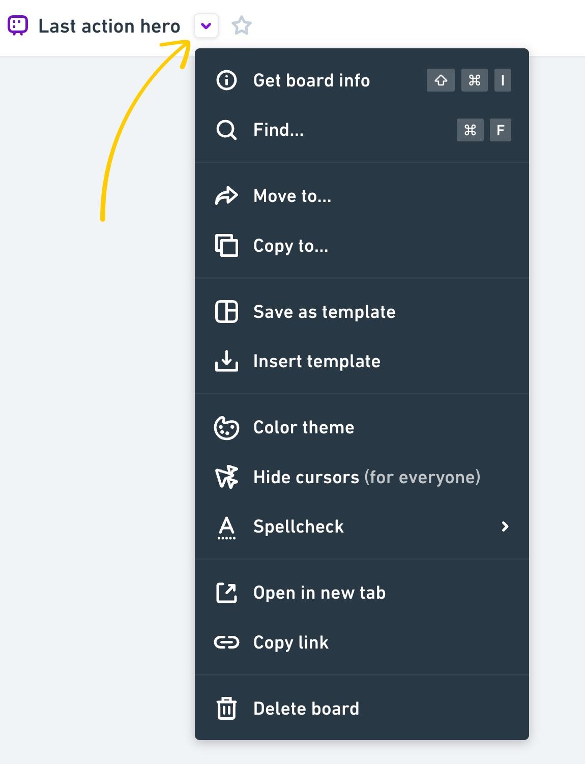 In a board (or any Whimsical file) you'll see a dropdown arrow next to the file's title. This is the file action menu and it allows you to move, copy or delete the file as well as change the theme and settings.