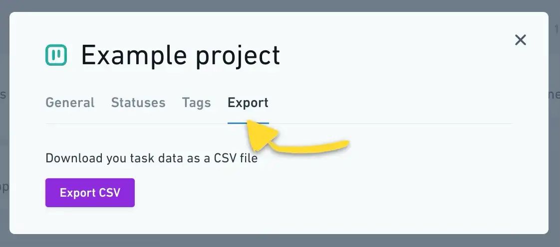 Each project can be exported individually as a CSV file. Open the project, click the gear icon at the top right to open project settings → select Export → Export CSV.