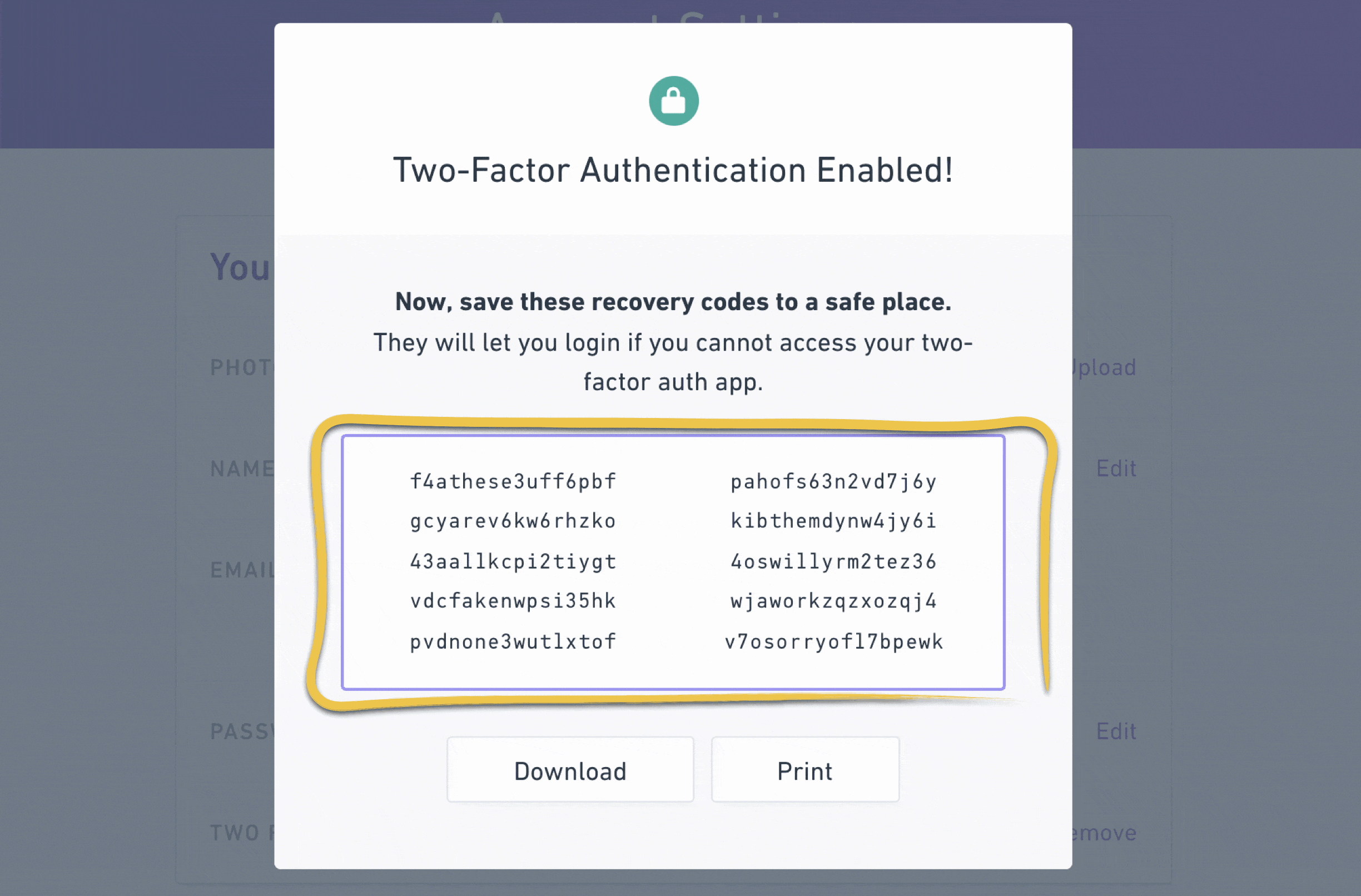 With the connection confirmed, you'll receive 10 recovery codes which you must save to a safe place, by downloading or printing them: