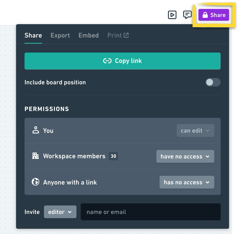 Click Share in the top right corner, to copy a shareable link, or invite people to access your file:
